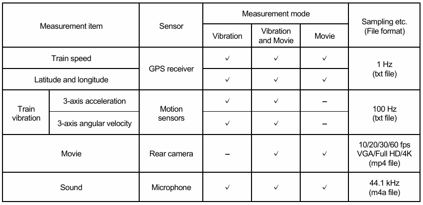 The application offers several measurement modes with different measurement items, such as “Vibration” and “Vibration & Movie,” which can be selected according to the purpose of use (see Table 1).