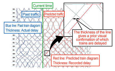 In practice, the method would be applied to operation control systems in the control room. Predicted delays and occupancy rates could then be displayed in the operation control system (Fig. 2). Train dispatchers can check the predicted delay or occupancy rate from the display, and arrange operations appropriately. In addition, these predictions can be used to provide passengers with information about traffic conditions, because large delays and high occupancy rates can be predicted in advance.