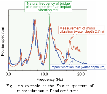 When rivers swell, the effects of attrition on bridge pier foundations can lead to instability, but it is impossible to visually check the state of foundations under flood conditions. It is also virtually impossible to carry out such checks by applying the method of determining natural frequency from the impact vibration caused by a weight, since impact vibration tests are generally difficult in terms of safety when water levels are high. By observing the minor vibration of bridge piers, therefore, the RTRI performed site surveys and tests to prove that the natural frequency of bridge piers can be determined with high precision from their minor vibration (Fig. 1).