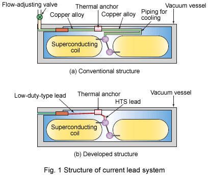 The current lead used for superconducting magnets (SCMs) in MAGLEV systems electrically connects the power source located in the external space at normal temperature and the inside of SCMs, which constitutes a current passing route when the SCMs are magnetized or demagnetized. Copper has conventionally been used as the material for this current lead conductor. However, to combat the joule heat generated by the large current flowing in the conductor and the heat conducting into SCMs through the conductor, the current lead is fitted with a gas cooling mechanism using helium gas evaporated inside the SCMs (Fig. 1 (a)).