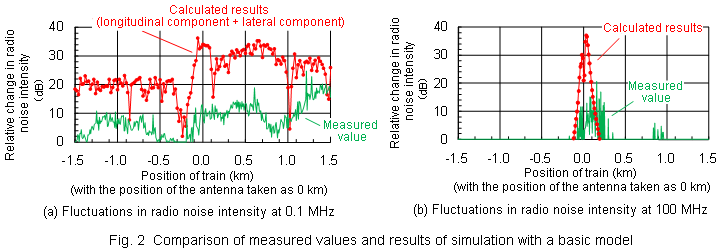 An international standard stipulates the allowable limit of radio noise radiated from running trains to wayside areas and a standard method of measuring such noise. However, the intensity of radiated radio noise, the position of the radiation source and its characteristics could not be obtained until now unless actually measured. The RTRI therefore developed a basic analysis model to regard running trains as a radio noise source (oscillator) and the combination of wiring on vehicles, trolley wires, rails and substations as a radiation source (antenna) (see Fig. 1). Simulation of a running train with this analysis model reproduced a state where radio noise was received. In the frequency zone of 10 MHz or lower, periodically fluctuating radio noise was received, which was emitted from a train running at a distance. In the frequency zone of 10 MHz or higher, on the other hand, radio noise was received only right in front of the train (Fig. 2). Based on these results, the RTRI clarified that railway radio noise can be thought of as being emitted from a loop antenna whose size changes significantly in the direction of train movement. Application of this technique makes it possible to judge whether the addition of capacitors or reactors and changes in wiring contribute to the reduction of radio noise.