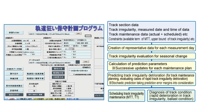 Using the above results, a frequent-measurement based track-maintenance planning system was developed (Figure 2). The locations identified as requiring track irregularity maintenance in the plan obtained by the system, were 10% closer to the actual sites needing maintenance compared with the conventional approach, indicating that this model offers plans which are a closer reflection of reality. The system can also be used for diagnosing rapid deterioration of track irregularity and ballast condition diagnosis.