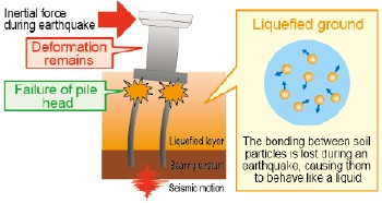 When liquefaction occurs during earthquakes, the ground suddenly loses its rigidity and hardness, leading to extensive pile foundation damage (Fig. 1).