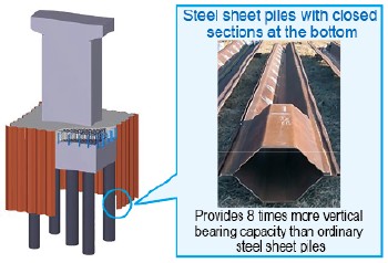 Work was therefore undertaken to find a new method which would not require a great amount of space, and which was practical and economical to implement. As such a sheet pile reinforcement method was developed using steel sheet reinforcement which improves both the supporting force and rigidity of the structure (Fig. 2).