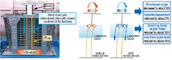 After clarifying the reinforcement mechanisms of steel sheet piles during shaking table tests on models using the new technique, confirmation was obtained that the developed method reduced shearing forces on the pile head by approximately 30% and axial force by approximately 20% (Fig. 3).