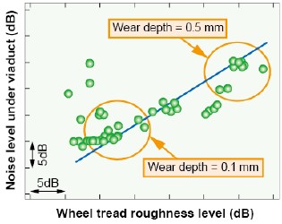 Then, based on the relationship between bridge noise and wheel roughness levels, based on the collected geometries, e.g. wear depth, it was confirmed that, when the roughness level is greater than that corresponding to a wear depth of about 0.1 mm, bridge noise increases siginificantly (Fig. 2).