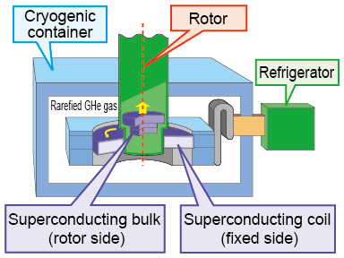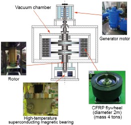 The demonstration machine used for verification tests (Figs. 2 and 3) had a 2 m diameter and a mass of 4 tons, supported by a CFRP superconducting magnetic-bearing flywheel. Rotations were adjusted through the generator motor; therefore, it was possible to test the system’s capacity to absorb and release 300 kW of power, and verify it could store 25kWh of power.