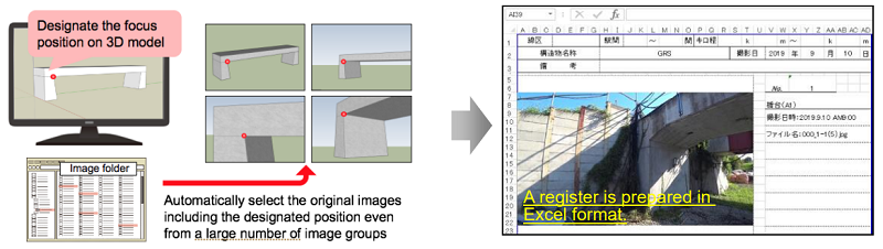 This system can also support to detect damages and make a register. Not only does a direct comparison of 3D images taken at different inspection timings make it easy to detect damages (Fig. 2), but also a comparison of cross-sections enables any change in shape to be evaluated quantitatively. In addition, because this system can automatically extract the original images from any points designated in a 3D image and can prepare an inspection register from those images (Fig. 3), it is no longer necessary to spend time organizing and extracting images after an inspection, resulting in a reduced burden of office work.