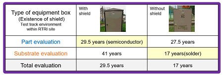 With this method, not only can the useful life of an electronic part be calculated according to the usage environment by utilizing the results of a reliability test implemented by the part manufacturer, but also the useful life of solder joints can be calculated by accelerated tests to reproduce solder cracks caused by temperature change, so as to identify weak points based on each calculation result and estimate the service life of equipment. An evaluation was attempted by applying this method to train detectors for grade crossing in two types of equipment boxes under different usage conditions--with and without a shield to block direct sunlight. The results confirmed that weak points could be identified under each condition and the estimated useful life could be calculated (Fig. 3).