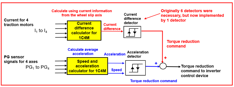 Two previously developed techniques that had proven records for tractive effort improvement: "acceleration detection" for a 1C1M locomotive and "current difference detection" for a 1C2M electric railcar were combined (Fig. 1) to make them applicable for a 1C4M electric railcar