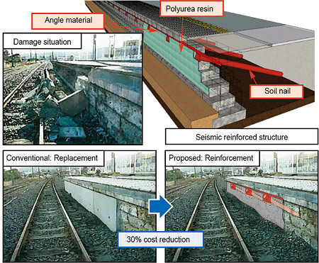 In past earthquakes, many of the masonry walls that make up masonry embankment type train platforms have tumbled or tilted, and seismic reinforcement methods to prevent such damage are required. Conventional seismic reinforcement requires the replacement of platforms, which is expensive. Therefore, we have developed a low-cost seismic reinforcement method that does not require replacement of platforms.