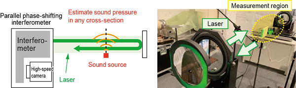 To visualize sound waves, we used a parallel phase-shifting interferometer (Fig. 1). This device captures images of the interference fringes of laser light with a high-speed camera, making use of the fact that pressure fluctuations in the air caused by sound can be observed as phase changes in the light. We also developed a method for estimating the sound pressure distribution within a specific cross-section based on the theoretical equations for spherical waves.