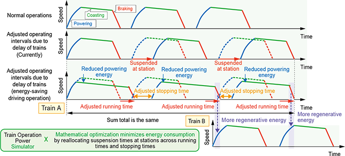 In the event of a small scale delay lasting a few minutes, trains are sometimes required to be suspended at stations. The aim is to prevent spikes in passenger numbers and also to avoid having trains slow down or come to a stop between stations. When a train proceeds slowly to the next station (instead of stopping at the previous station), we can reduce powering energy (see Figure 1). Meanwhile, by adjusting the suspension time at stations and coordinating the timing of powering and braking by the affected trains, we can increase regenerative energy (see Figure 1). To date, we have not been able to reconcile these two seemingly conflicting objectives. But our proposed energy-saving driving operation uses mathematical optimization and simulation to achieve both objectives simultaneously. We begin by defining the regenerative power interchange index, the potential for regenerative power interchange during periods when powering and braking coincide for two separate trains (see Figure 2). We then use an existing Train Operation Power Simulator to calculate, for each train in turn, how travel time between stations affects powering energy. Mathematical optimization tries to minimize the difference between total powering energy and the sum of the regenerative power interchange indices multiplied by the coefficient W. A larger W value indicates higher priority to regenerative power interchange.
