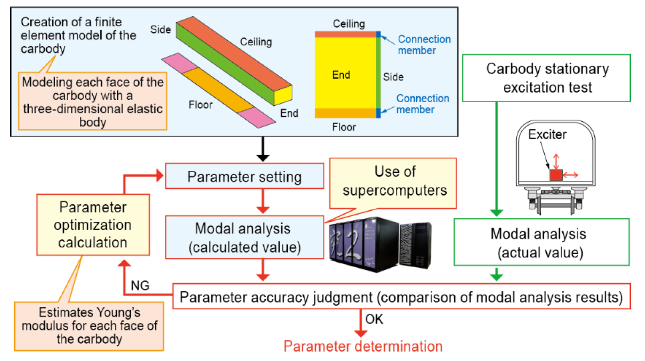 Various carbody vibration analysis models have been proposed to predict carbody vibration characteristics associated with structural modifications during vehicle design. However, existing analytical models struggled to accurately reproduce vibrations at high frequencies above 20 Hz. To accurately reproduce carbody vibrations at frequencies of 20 Hz and above, which increase at high speeds, we used the finite element method to model each carbody face and the connections between them as a three-dimensional elastic body. To efficiently and automatically adjust parameters not directly obtainable from drawings, such as the apparent Young’s modulus when each face of a carbody, composed of multiple members, is represented as a single elastic body, we developed a method to determine these parameters based on measured natural modes of vibration of the carbody (Figure 1).