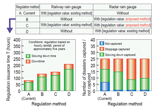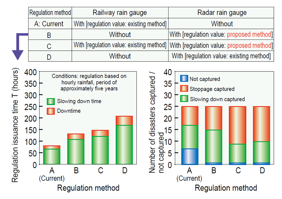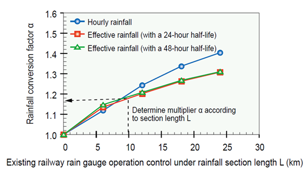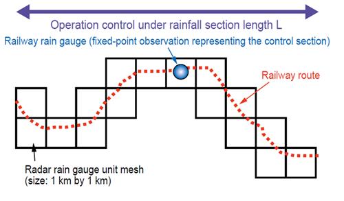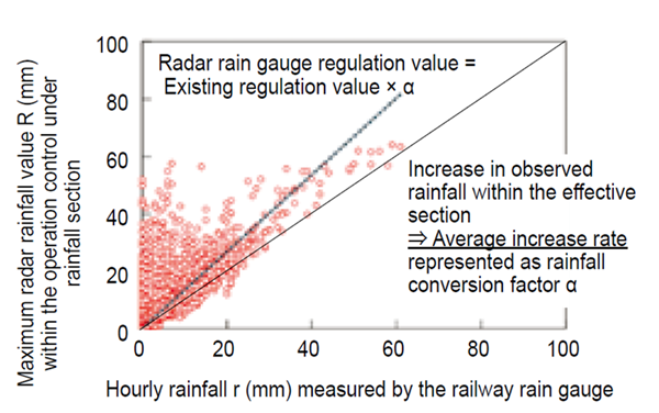 Currently, railway rain gauges are installed at intervals of several tens of kilometers, and operation control under rainfall based on rainfall observed at these fixed points may fail to detect localized heavy rain occurring far from the gauges. To address this issue, the introduction of radar rain gauges, which can monitor rainfall over a wide area, is being considered (Figure 1). In this study, we proposed an easy method to set regulation values for radar rain gauges based on the regulation values of existing railway rain gauges and information such as their installation intervals. Specifically, when an operation control is issued due to the radar-measured rainfall in any unit mesh within the operation control under rainfall section (Figure 1) exceeding the current regulation value, the rainfall observed by the radar rain gauge tends to be higher than that of the railway rain gauge (Figure 2, with the average increase factor denoted as rainfall conversion factor α). This may cause a significant increase in restriction issuance time, raising concerns about excessive protectionism. Therefore, the regulation value for the radar rain gauge is set by multiplying the rainfall conversion factor α by the existing railway rain gauge regulation value. We also analyzed the relationship between the average operation control under rainfall section length L and the rainfall conversion factor α (Figure 3), enabling easy determination of α based on this relationship. The simulation results showed that in cases where the regulation values for radar rain gauges were set using this method (B and C in Figure 4), compared to the current case with existing regulation values set for railway rain gauges (A in Figure 4), the regulation time slightly increased while the number of captured disaster events also increased. This indicates improved safety without excessively extending the regulation time (D in Figure 4).
