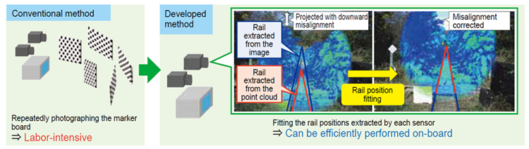 To address this, we developed a forward obstacle detection system for trains using sensor fusion. This system integrates a visible light camera, a LiDAR sensor, and a far-infrared camera. It uses AI to extract the railway track area from visible light camera images, detects objects that have entered the railway track area, measures distance using LiDAR, and detects temperature using the far-infrared camera. On the other hand, integrating multiple sensors requires calibration (correction and adjustments) of each individual sensor, a process that can be complex and time-consuming. To address this, we developed a method for collectively calibrating various sensors using railway-specific rail information (Figure 1).