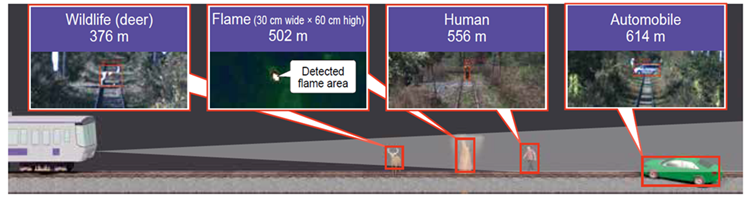 In verification tests conducted on actual straight railway tracks, the system was able to detect wildlife (deer) at up to 376 meters, wayside fire flames at up to 502 meters, people at up to 556 meters, and automobiles at up to 614 meters (Figure 2).
