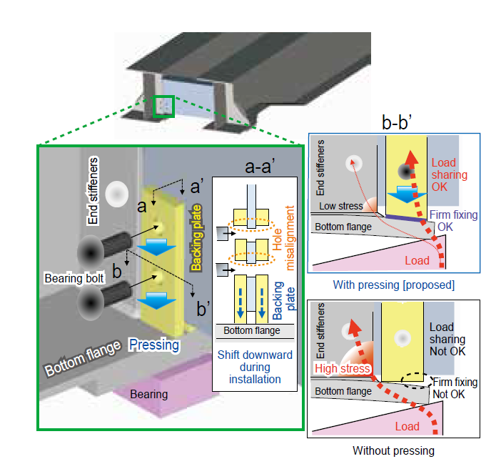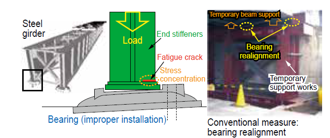 At the support sections of welded steel girders, improper installation of bearings can cause inadequate support of the girder, leading to stress concentration in the welds at the lower end of the edge stiffeners during train passage, which may result in fatigue cracks (Figure 1). To prevent fatigue cracks, it is necessary to improve the bearing installation condition. However, this requires temporarily supporting the girder, which entails considerable costs for installing temporary supports and related work.