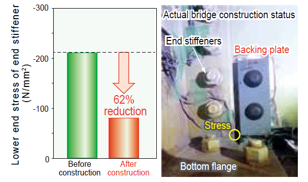 Therefore, we developed a reinforcement method that reduces stress concentration at the welds and prevents fatigue cracks by reinforcing the lower end of the edge stiffener with the backing plate (Figure 2). Simply connecting the backing plate to the edge stiffener does not ensure a firm fixing with the bottom flange on the bearing, so it does not share the load during train passage and therefore does not provide effective reinforcement. In this method, the backing plate is pressed and fixed firmly against the bottom flange on the bearing, allowing it to share the load and provide reinforcement. The pressing of the backing plate is performed manually in a short time by shifting the plate toward the bottom flange by driving in bearing bolts, making it applicable even in the confined construction environments around the bearing sections. Since this method allows construction without temporarily supporting the girder, it can prevent fatigue cracks at less than 10% of the cost of conventional methods. The method was applied to an actual bridge, and it was confirmed that the stress at the lower end of the edge stiffener during train passage decreased by approximately 60% after construction (Figure 3).