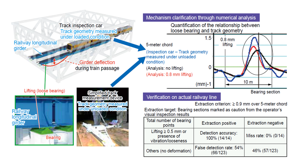 To address this, we first developed a numerical analysis method and clarified the characteristic increase in track geometry amplitude at locations with loose bearing. Based on this property, we developed a method for identifying loose bearing locations by using the amplitude of track geometry obtained by subtracting the track geometry measured under unloaded condition (recorded by a simplified track measurement device) from the track geometry measured under loaded condition (recorded by a track inspection car) as a detection indicator. This method was applied to 137 bearing points along an actual railway section with multiple consecutive simply supported steel bridges with ballastless steel tracks. As a result, all 14 bearing points that had previously been identified as critical by the railway operator were successfully detected due to vibration or due to an uplift gap of 0.5 mm or more observed during visual inspections (Figure 1).