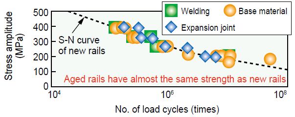 Although rail replacement cycles are set based on the fatigue test results targeting bending fatigue at the base of rails, rails that remain in sound condition are considered to have the potential for much longer service life.