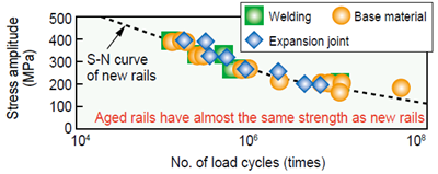To address this, both fatigue tests of actual rails and rotating bending fatigue tests with 500 million load cycles, equivalent to approximately 5 billion passing tonnages, were conducted on aged rails including welded joints, non-welded rail sections, and expansion joints that had reached approximately 1 billion passing tonnages, which is the current replacement threshold. The results showed minimal reduction in fatigue strength compared to new rails (Figure 1), suggesting that continued use beyond 1 billion passing tonnages is feasible and that fixed replacement cycles could potentially be eliminated.