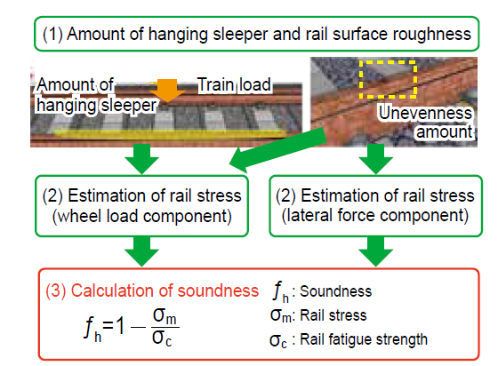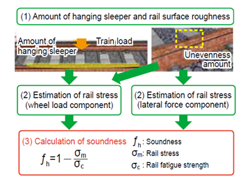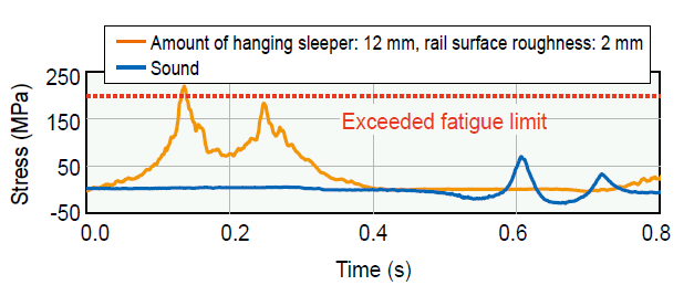 On the other hand, fatigue damage at the base of rails can occur before reaching the replacement cycle in areas where hanging sleepers or localized irregularities on the top surface of rails are observed. Stress measurements conducted at such locations, along with numerical analysis simulating track conditions, revealed that the stress generated in the rail during train passage can reach several times that of those in sound conditions, exceeding the fatigue limit and causing damage (Figure 2).