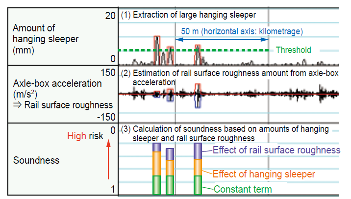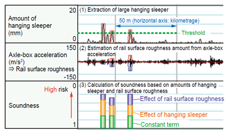 Based on these findings, we proposed a method for quantitatively evaluating the possibility of rail failure by estimating fatigue due to stress through numerical analysis, using the amount of hanging sleepers and rail surface roughness calculated from track measurement data. This method was implemented in the LABOCS track maintenance management database system (Figures 3 and 4).