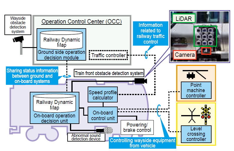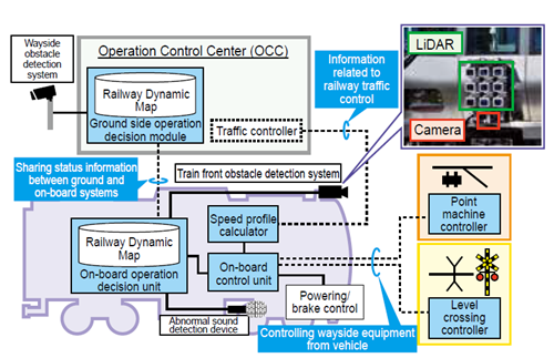 This system consists of an on-board control unit, an operation decision module, a speed profile calculator, a train front obstacle detection system, an abnormal sound detection device, a wayside obstacle detection system, a traffic controller, point machine controllers and level crossing controllers (Figure 1). These devices work in coordination, with information detected by the monitoring systems mapped on the Railway Dynamic Map within the operation decision unit. This information is shared between ground and on-board systems, as well as among trains, enabling each train to autonomously determine whether to continue operation, avoid hazardous events automatically, and resume operation when appropriate.