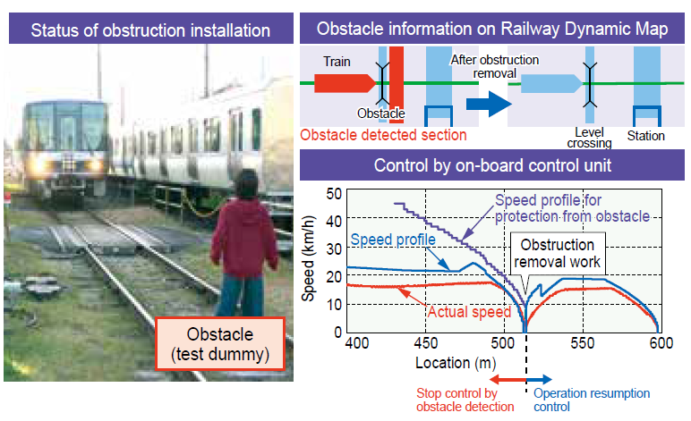 Using a prototype system, we conducted demonstration tests on the test track at the Railway Technical Research Institute. Through these tests, we confirmed several key functions: automatic train operation while controlling wayside equipment in accordance with calculated speed profiles; automatic hazard avoidance by having the on-board operation decision unit command the train to stop based on information from the train front obstacle detection system detecting obstacle on the railway track; and resumption of operation after the obstacle is removed, based on automatic judgment by the on-board operation decision module (Figure 2).
