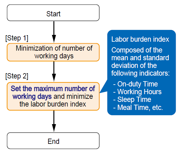 To date, we have developed an automated method for generating crew schedules focused specifically on workforce efficiency. However, since workforce efficiency and labor burden are in a trade-off relationship, the previously developed method struggled to balance both effectively, and faced significant increases in computation time on high-density lines. Therefore, we defined a new labor burden index representing factors such as on-duty time, working hours, sleep time, and meal time. Using mathematical optimization techniques, we developed a two-step solution method that first minimizes the number of working days, an indicator of workforce efficiency, and then reduces the labor burden index within the obtained upper limit of working days (Figure 1). This enables the generation of crew schedules that prioritize workforce efficiency while considering crew labor burden, all within a short time.