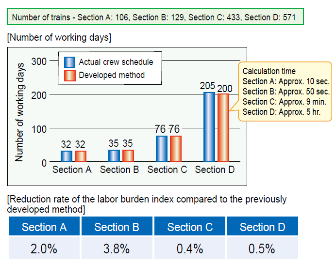 The developed method can generate the crew schedules in approximately five hours on a commercially available personal computer even for high-density lines with over 500 trains per day. Compared to actual crew schedules generated by personnel over several days, the method achieves equal or fewer working days while improving the labor burden index over the previously developed approach (Figure 2). This method enables labor-saving and de-skilling in the generation of crew schedules.