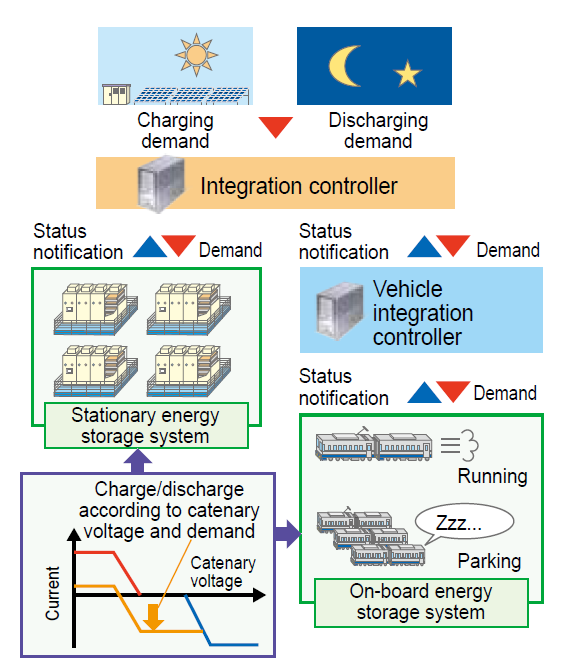 Energy storage systems for DC traction power supply systems are mainly introduced for energy saving by absorbing regenerative energy, and for use as emergency power sources. We explored the stable utilization of renewable energy, which fluctuates significantly depending on the time of day, by coordinating the charge/discharge control between fixed installation systems and on-board systems.