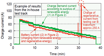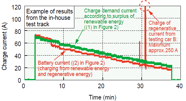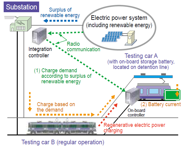 We developed an algorithm that integrally controls the charge/discharge of railway energy storage systems according to the amount of surplus renewable energy (Figure 1). In this algorithm, the integration controller distributes charge/discharge demands to the controllers of each energy storage system in a way that equalizes their state of charge as much as possible. To evaluate the effectiveness of the developed algorithm, we implemented a control function to charge/discharge an on-board energy storage system on a single train set, triggered by charge/discharge demands (Figure 2) and made several tests on the test track at the Institute. As a result of tests assuming a surplus of renewable energy, we demonstrated it is possible to charge the on-board storage battery with a surplus of the renewable energy based on the current demand from the integration controller, as well as charging regenerative electric power of another running vehicle as needed (Figure 3).