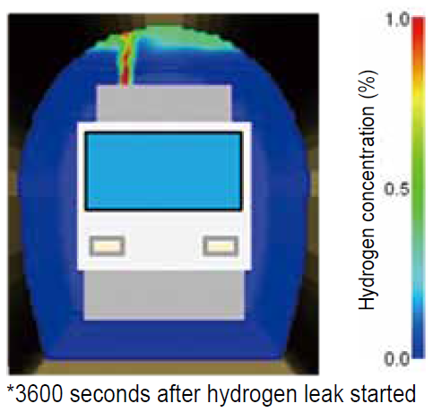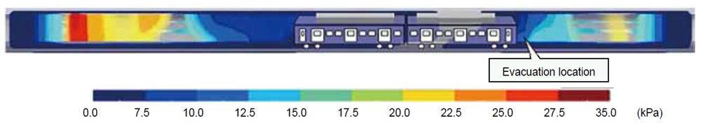 Based on past railway accident investigation results, we developed scenarios and conducted a risk assessment including numerical analyses. We also proposed safety measures such as leak and pressure detection devices, safety valves, shut-off valves, and structural protections (Figure 1). In particular, regarding hydrogen flow in enclosed spaces such as tunnels, we conducted simulation-based verification of small leaks from rooftop equipment piping on hydrogen fuel cell vehicles and large releases from thermal safety valves during fires. As a result, for small leaks, it was found that even in areas considered high-risk due to queues, the concentration remains below 4%, which is the lower flammability limit (Figure 2). Regarding large releases, and assuming ignition scenarios, we estimated the pressure exerted on the human body at evacuation points in the event of a hydrogen explosion and confirmed that it remains within the acceptable limit of 20 kPa or less (Figure 3).