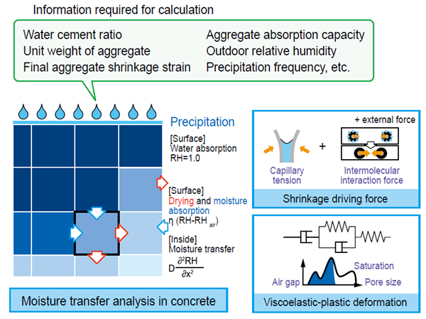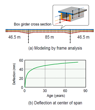 We developed a shrinkage strain analysis program that calculates the time-dependent changes in water content distributed within concrete based on moisture transfer analysis using diffusion theory. The program predicts the shrinkage-driving force and deformation amount of the concrete up to 100 years ahead according to the water content (Figure 1). By macroscopically capturing physical and chemical phenomena such as hydration in concrete, the amount of information required for calculations is greatly reduced. Using only information measurable in practical work, the program calculates shrinkage strain according to water content conditions and mix proportions. By inputting this shrinkage strain into a structural analysis tool (frame analysis) using steels or beam elements that consider member shapes, the long-term deformation amount of concrete bridges is calculated (Figure 2). The validity of this method has been confirmed by comparing the calculated shrinkage strain using precise methods and the measured deflections of bridges.