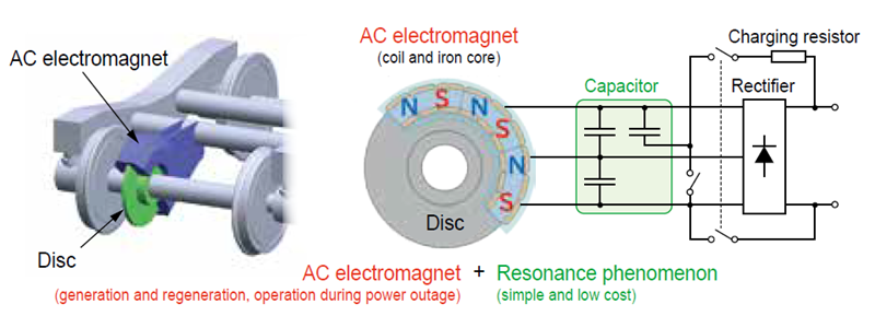 We proposed a non-contact disc brake (Figure 1) with a simple circuit configuration that does not use inverters or similar equipment, enabling a simplified electric brake system for trailers. In this electric brake, braking force and regenerative electric power are generated by flowing electric current through resonance phenomenon between an electromagnet and a capacitor.