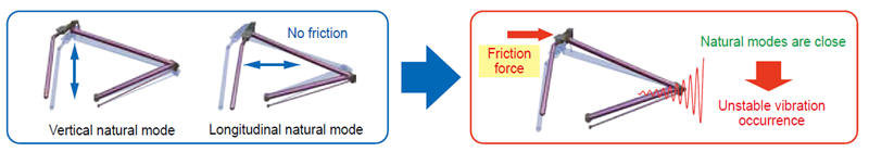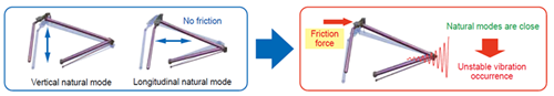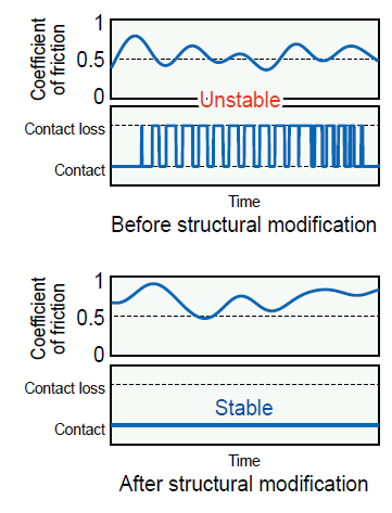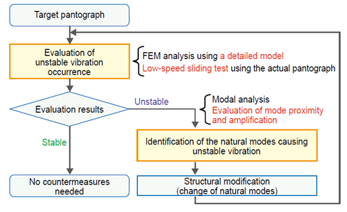 Through analysis using a detailed pantograph model, we clarified that unstable vibrations occur when the vertical and longitudinal natural modes come close and amplify each other under a high coefficient of friction (Figure 1). Based on this mechanism, we proposed a flowchart for reducing unstable vibrations (Figure 2). In this flowchart, we evaluate whether significant unstable vibrations occur, either through FEM analysis using a detailed model or through low-speed sliding tests with an actual pantograph. Furthermore, by conducting experimental modal analysis and evaluating the proximity and amplification of modes, the natural modes requiring countermeasures are identified. Structural modifications, such as using softer plate spring, can then reduce unstable vibrations even under a high coefficient of friction (Figure 3).