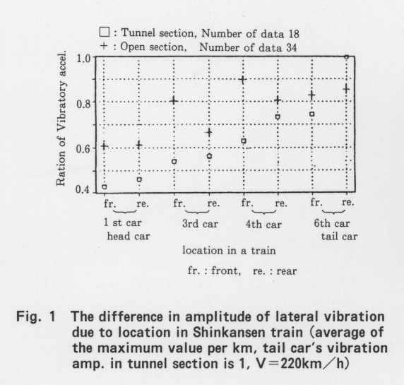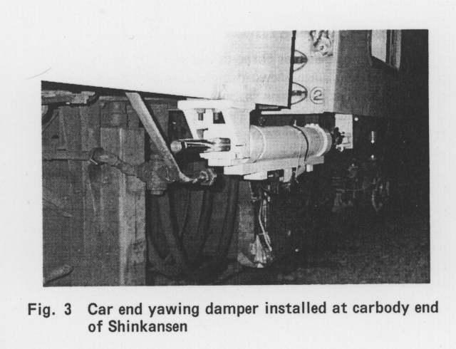 From the vibration data obrained simultaneously on several cars in the same Shinkansen train, it was observed that the vibration amplitude of the tail car is greater than those of the other cars in a train (Fig.1). Our analysis arrived at the conclusion that the vibration mode of a train has a tendency for the tail car to vibrate more than the others when the carbody hunting characteristics of the train for the yawing mode are likely to emerge, and when aerodynamic forces work in tunnel section. Referring to these results, it was found by simulation analysis, etc. that two car end yaw dampers longitudinally and parallel installed between car ends (Fig.2) in proportion to the angular velocity, are effective to decrease the train vibration including the tail car's vibration. However, this method has not so far been used for the Shinkansen train of the type having two bogies per each carbody. A prototype of the car end yaw damper for Shinkansen was designed with the proper damping coefficient obtained through simulation analysis. In order to keep the damping coefficient satisfactorily even in small stroke area of 1 or 2mm, corresponding to p-p 2m/s2 car body lateral vibration, a doulbe rod type damper (fig.3) was adopted. The maximum of about 35% decrease of yawing vibration due to this damper was verified (Fig.4) in tests up to 310km/h on Shinkansen train. However, it is found that the effectiveness to decrease train vibration with the car end yaw damper differs depending on the location in a train, the train speed, the vibration amplitude and the phase between cars etc., as well as on the damper's coefficient. In order to find out the reason, we analyze the relations between the effectiveness and the factors using a simplified analysis model. From the analysis, it is seen that 180 degrees phase difference (reverse phase) between cars is important, and this is actually realized for primary vibration. On the contrary, in the section (tunnel section etc.,) with high frequency vibration it seems that the effectiveness of vibration reduction drops. The reason is considered as follows: (1) An elasticity develops in the damper is series due to the oil compressibility and the flexibility of attachment. (2) An equivalent damping coefficient ceq is expressed as ceq = k2c/(k2+(c omega)2)(k:elasticity, c:damp.coef. omega:vibration freq.). And the larger omega is, the smaller ceq becomes. Our research deals with the lateral vibration data collected mainly from the tail car of Shinkansen train, the inference of the reason for the greater tail car's vibration, the computer simulation analysis for decrease of train vibration by means of the car end yaw damper, the result of running test, and the analysis for the effectiveness of damper using a simplified analysis model.