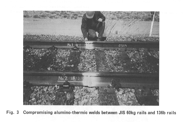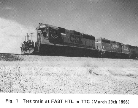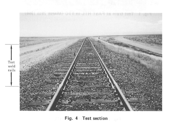 Railway Technical Research Institute (RTRI) signed a contract with Association of American Railroads (AAR) in 1995. In the contract, AAR agreed to provide the facilities and resources necessary to conduct or support the testing on RTRI-provided equipment and/or material at the Transportation Technology Center (TTC), Pueblo, Colorado. As a first test, the accelerative test of rail gas pressure welds was started at the Facility for Accelerated Service Testing (FAST) High Tonnage Loop (HTL) in March 1996 (Figure 1). The objective of this test is to obtain some data on welded rail end batter (WREB) of Japanese Industrial Standard (JIS) 60kg standard carbon rail in track, thereby to establish the maintenance and control methods for longitudinal rail profile on running surface. The WREB has an effect on the fatigue strength of rail weld, and causes running noise and track vibration during train operation. The two 25 meter long JIS 60kg rails containing three gas pressure welds on each rail, which were executed under various welding and postweld heat treatment conditions, were installed in section 5 of FAST HTL (Figure 2); these weld rails were joined with 136lb head-hardened rails by compromising alumino-thermic welds (Figure 3) and located on tangent track on both sides (Figure 4). At the present HTL, train operation is bi-directional under 39-ton heavy axle loads, and the gross tonnage passed is about one million gross tons (MGT) per day. In this test, longitudinal rail profile and hardness on running surface at each weld as the static data, and vertical force, bending stress and vibration acceleration at two selected welds as the dynamic data are measured at 0, 10, 25, 50, 75 and 100 MGT. The test plan is set for about one year.
