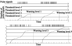 The number of pulse signals from the vibration sensor when the detection poles start vibration at the moment of an avalanche, depends upon the impact force to the poles and the duration of the avalanche. In the event the impact force is large and the avalanche duration long, the number of emitted pulse signals increases. From this, for an avalanche, we can consider the total number of pulse signals as an index to denote the scale of an avalanche. Considering this relationship, the system has a significance scale of four output levels according to the number of pulse signals; threshold 1, threshold 2, threshold 3 and threshold 4. If any avalanche of certain scale occurs, it is evaluated to any of these four levels. When the number of pulse signals does not reach level 1, we consider there is no avalanche. Thanks to this mechanism, we can prevent outputting of an useless avalanche warning (erroneous detection), if the case concerned is vibration of detection poles due to a strong wind, small ground vibration and small snow fallings which are not likely to hinder operation of trains.