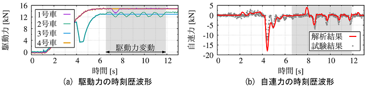このような編成前後運動を扱う場合、車両間を繋ぐ連結装置のモデル化が重要になります。鉄道総研では、救援等で生じる著大な自連力の推定を目的として、連結装置の精緻なモデルを導入した数値解析手法が開発されています1)。現車試験結果と本手法による数値解析結果を比較したところ、微小な自連力変動に対しても現車試験結果と数値解析結果が一致2),3) することを確認しました(図2)。これにより、駆動トルク変動に対する編成前後方向の運動解析を精度良く実施することが可能になりました。また、編成前後方向の共振現象について、連結装置が有する非線形性を考慮した知見も得られつつあります3)。
