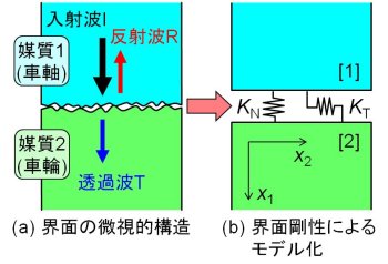 車軸に車輪をはめ合わせる際には、車輪の内径が車軸の外径よりもわずかに小さくなるように機械加工した後、両者を所定の粗さに仕上げて圧入します。そのため、両者のはめ合い面(界面)は微視的には図2(a)に示すように、ある粗さを有する面同士が、直径差(締め代)により生じる面圧で接触した状態にあります。この状態は近似的に、KN、KTの2種類のばね(界面剛性)を有する図2(b)の「スプリング界面」によりモデル化されます。これにより、はめ合い面に超音波が入射したときの超音波の反射や車輪への透過の程度を理論的に計算することができます。