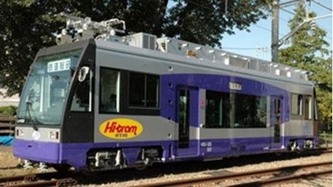 回生エネルギーの有効利用による様々な効用の実現を目指して、1999年から架線と車載蓄電によるハイブリッド電源形電車の研究開発を進めてきました。2003年8月には、リチウムイオン二次電池を搭載した中古路面電車改造によるエネルギー回生形バッテリートラムの試験車両”りっちぃ・とらみぃ”を公開しています。2005年度より3年間は、NEDO(独立行政法人 新エネルギー・産業技術総合開発機構)の委託を受け、これまでの研究で得られた技術的成果を設計に反映した営業線を走行可能な架線・バッテリーハイブリッドLRV (Light Rail Vehicle)LH02形電車 愛称:”Hi-tram(ハイ!トラム)”(図1)を開発製作しました。