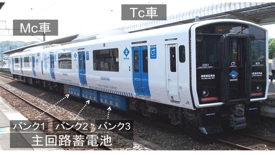 2016年にJR九州他と共同で、リチウムイオン電池を搭載して非電化区間を走行できる交流架線式蓄電池電車BEC819系"DENCHA"を開発しました(図1)。蓄電池電車はブレーキ時に発生する回生電力を確実に再利用できるため省エネ性が高いことと、気動車と比較して騒音や保守費を低減できることが特長です。