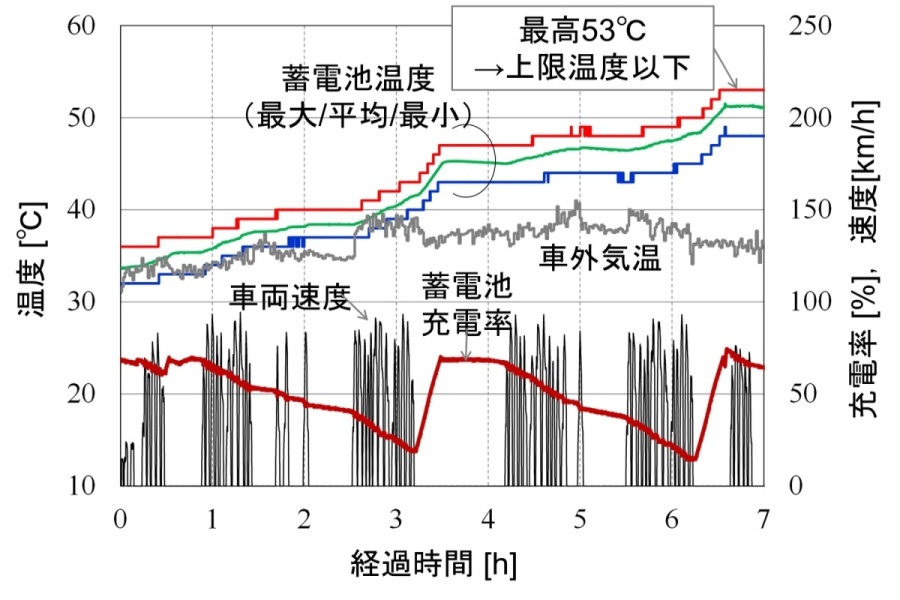 鉄道総研が提案した主な技術は、1)蓄電池の充放電器(チョッパ装置)を追加搭載しないで済む蓄電池直結の回路構成(図2)、2)高電圧蓄電池では大規模となりやすい短絡事故を抑制するヒューズ配置です。車両落成後の走行試験では、消費電力量や蓄電池の温度等を評価(図3)し、様々な走り方や将来の劣化状態に応じて蓄電池の温度上昇を推定する熱モデルを構築しました。