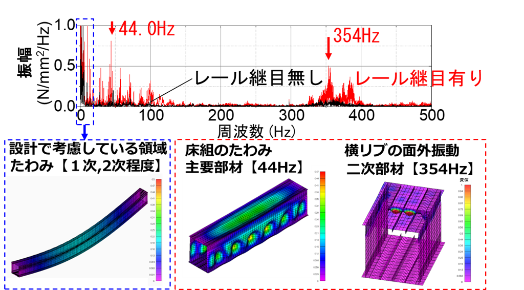 箱形断面の桁を対象にレール継目有り/無しをパラメータとして横リブ-縦リブの交差部で応力を計測しました。その結果、レール継目有りでは、高い振動数で横リブが大きく振動していることを明らかにしました(図4)。