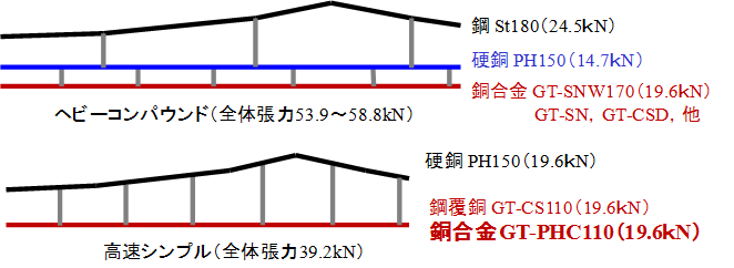 PHCシンプル架線は、高強度の銅合金トロリ線であるPHCトロリ線 (Precipitation hardened copper alloy contact wire) を採用することにより、高速性と経済性を両立した架線方式です(図1)。従来の新幹線(東海道・山陽、東北、上越)では、3本の線条で構成されるヘビーコンパウンド架線が採用されていますが、整備新幹線区間では、2本の線条で構成される高速シンプル架線が採用されています(図2)。このPHCシンプル架線は、鉄道・運輸機構、JR東日本、鉄道総研の三者で開発しました。