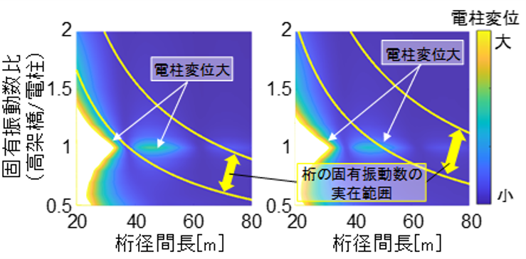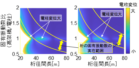 桁式高架橋などの一部において列車通過時の高架橋の桁振動により電柱が振動し、架線線条が疲労破断する事象が発生しています。この事象の発生状況は、高架橋の桁や電柱の形式・種類によって異なることから、電車線路設備損傷の発生条件を明らかにして、対策要否判定基準を明確化することが必要です。そこで、高架橋と電柱の複雑な連成問題を計算可能な連成振動解析法を開発し、解析値が営業線における実測値と概ね一致することを確認しました。また、この解析法を用いて、電柱振動が大きくなる桁径間長および高架橋と電柱の固有振動数比の条件を提示しました(図1)。提示した条件は、電車線路設備の損傷の可能性がある既設鉄道橋のスクリーニングや電車線路設備の対策工の選定に活用できます。