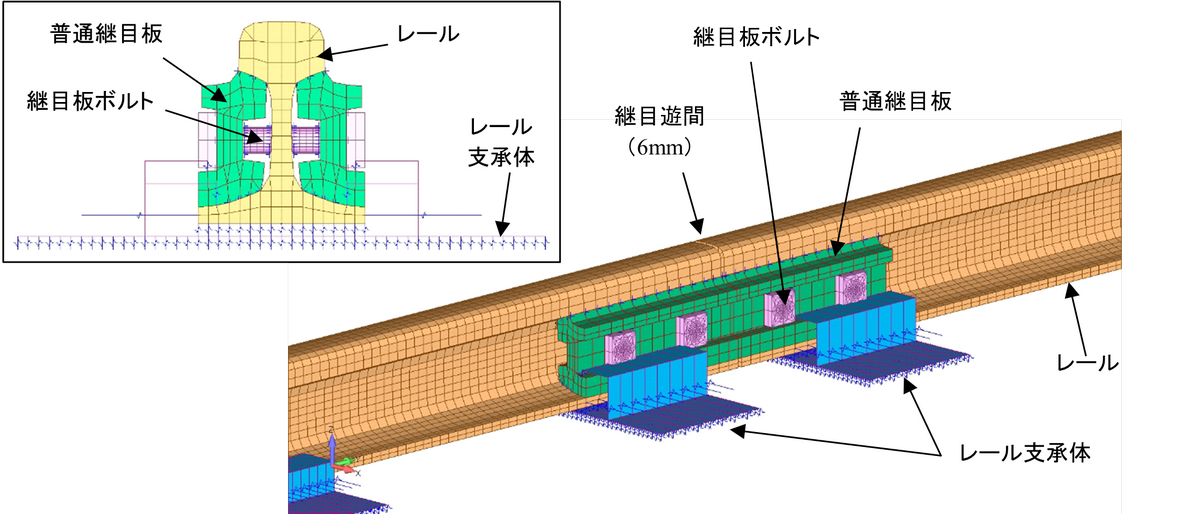 また、軌道の三次元非線形解析モデルは、当初レール一般部用のみを模擬したものでしたが、その後レールが不連続で継目板で拘束されたレール継目部を模擬した解析モデルを開発しました。これにより、レール継目部で使用するレール締結装置の性能照査を、レール締結装置一組で実施するための試験荷重条件の算定が可能になりました。